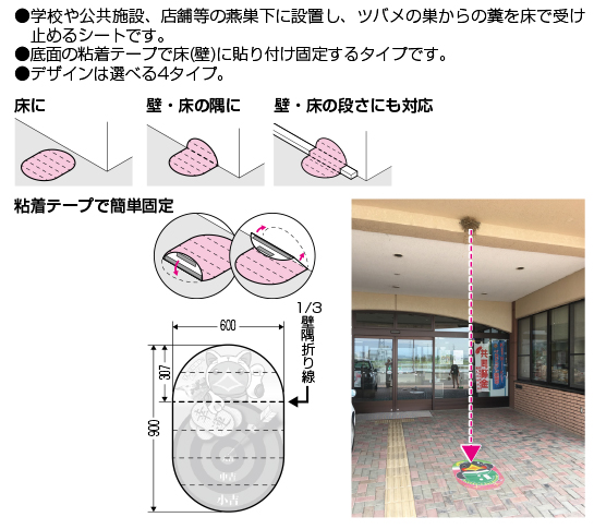 このシートは学校や公共施設、店舗等の燕巣下に設置し、ツバメの赤ちゃんの糞を許容しながら巣立ちを見守る、ほんわかとした人間味のある暖かい愛情を育てられる衛生向上、道徳心高揚を兼ねた商品です。